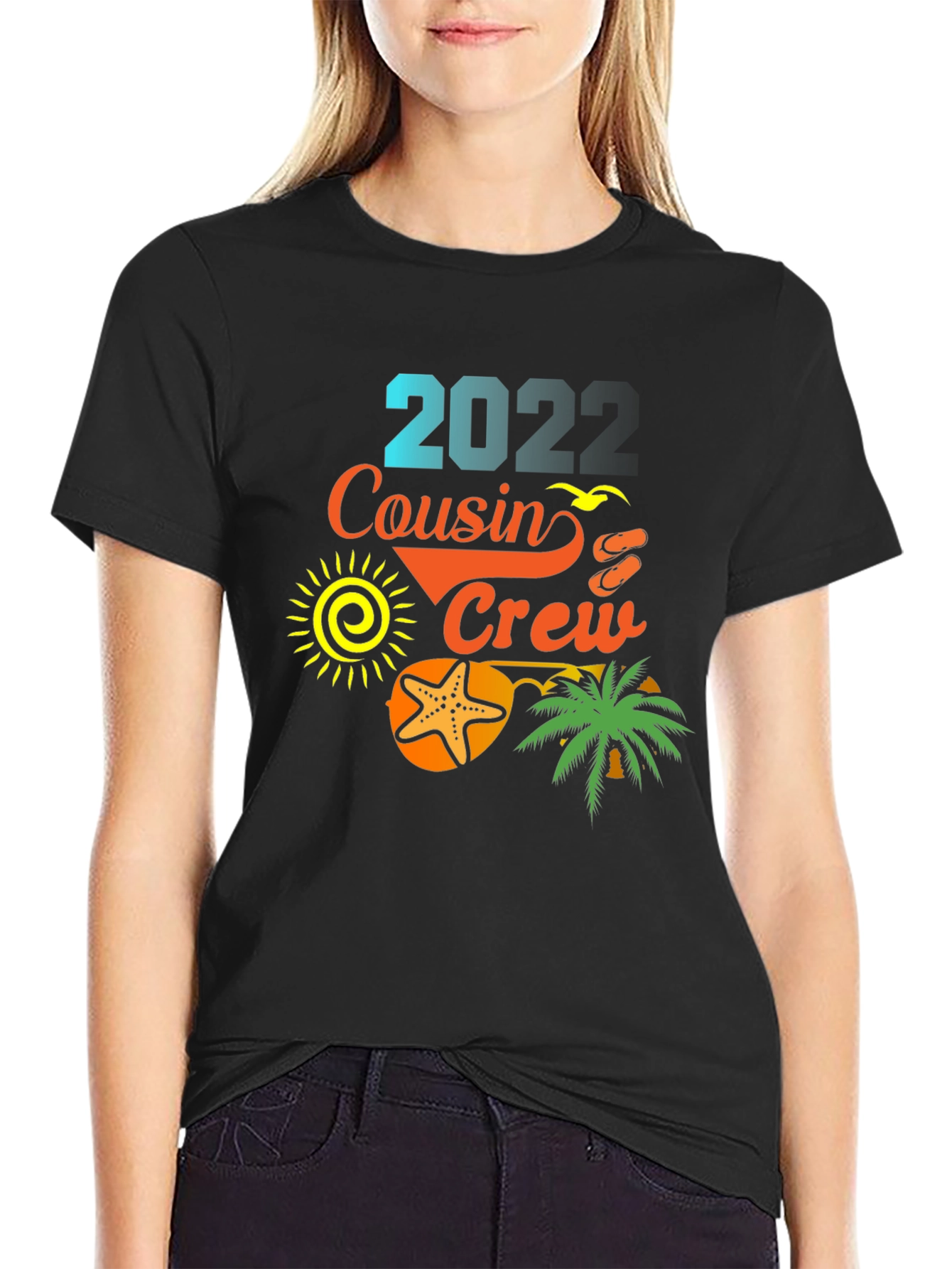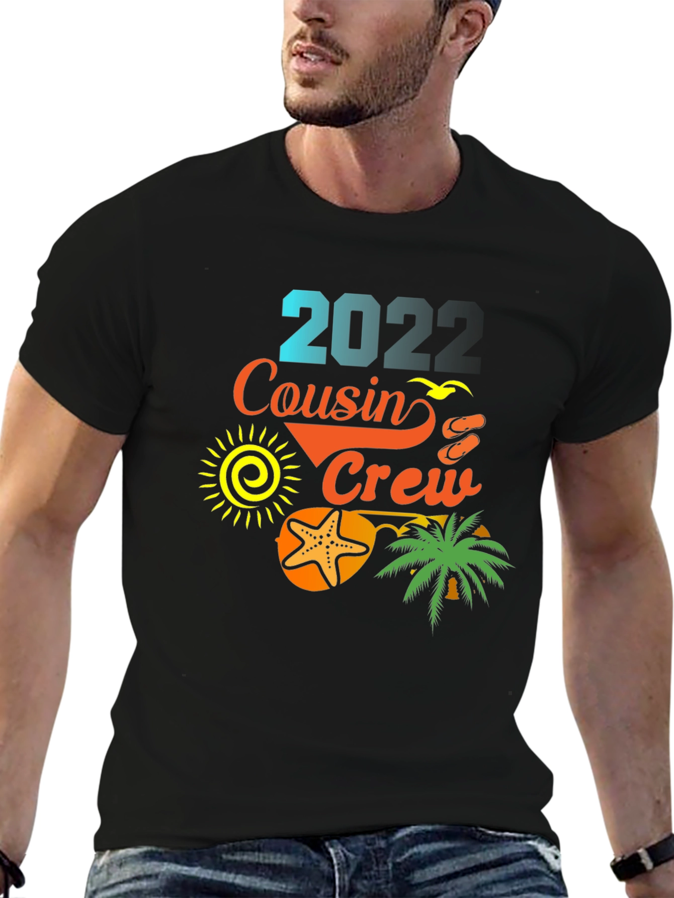 Get ready for your summer vacation with this stylish "2022 Cousin Crew" t-shirt! This black tee features a vibrant and playful design incorporating beach-themed elements like a sun, starfish, palm tree, and flip-flops. The text "2022" is rendered in a cool blue gradient, while "Cousin Crew" is in a sunny orange. This makes it perfect for family trips, beach outings, or any summer gathering where cousins unite. It's a fun and festive way to celebrate summer and family. Grab yours now and make some unforgettable memories with your crew!