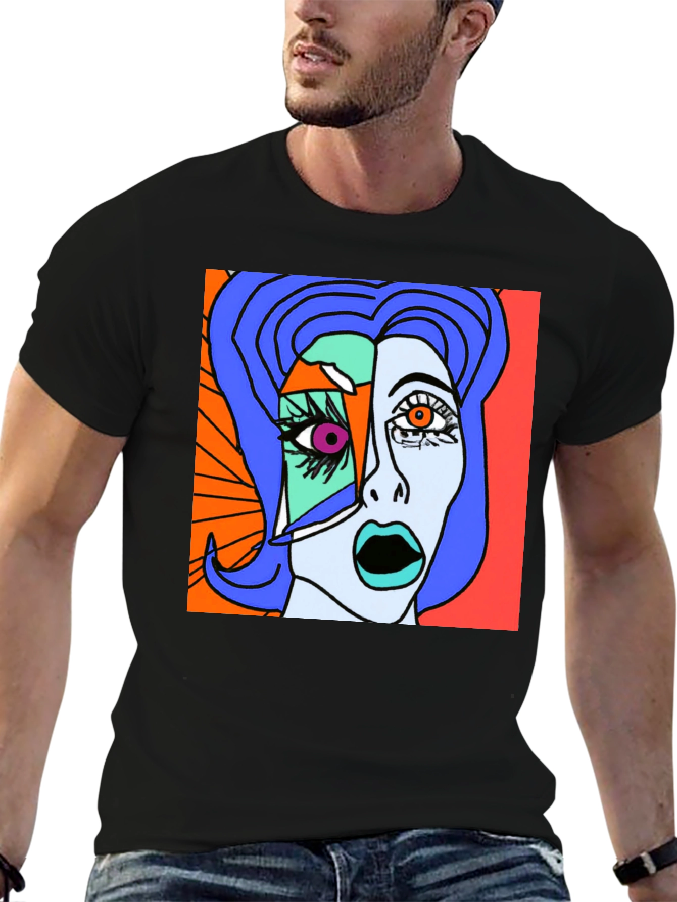 Express yourself with this unique abstract art graphic t-shirt. Made from a comfortable, breathable fabric, this tee features a bold and vibrant design that is sure to turn heads. The striking artwork showcases a modern and artistic aesthetic, making it a standout piece in your wardrobe. Perfect for casual wear, concerts, or art events, this stylish tee adds a touch of creativity to any outfit. Pair it with jeans, shorts, or a skirt for a fashionable and individual look. Elevate your style with this eye-catching and comfortable art-inspired t-shirt.