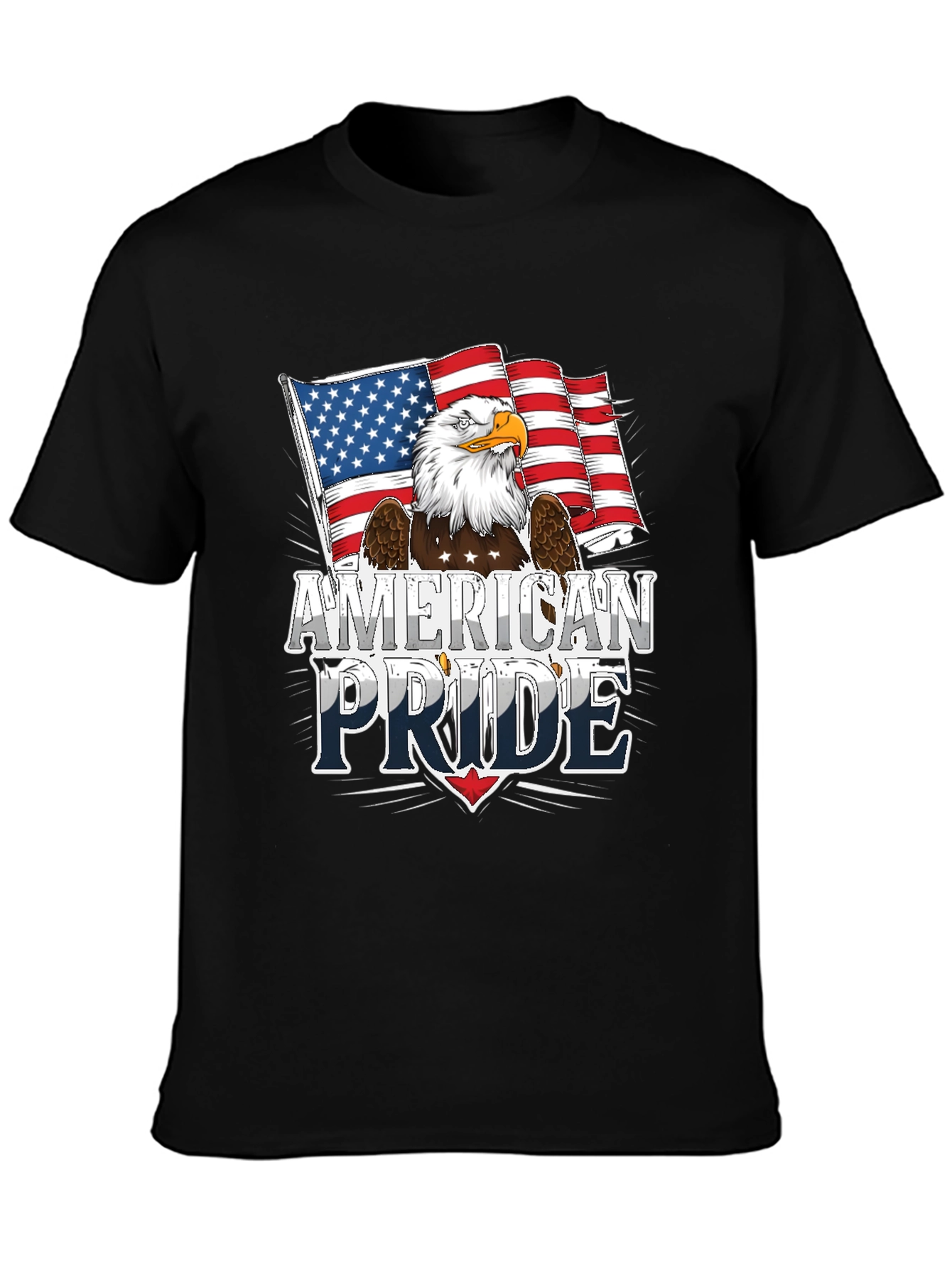 Show your American pride with this bold black t-shirt. Featuring a striking graphic of an American eagle in front of the US flag, overlaid with the words "American Pride" in a vintage font. Perfect for patriotic holidays, rallies, or everyday wear, this shirt is a great way to show your love for the USA. The design incorporates stars and stripes to highlight its patriotic theme. It’s a comfortable and stylish statement piece.