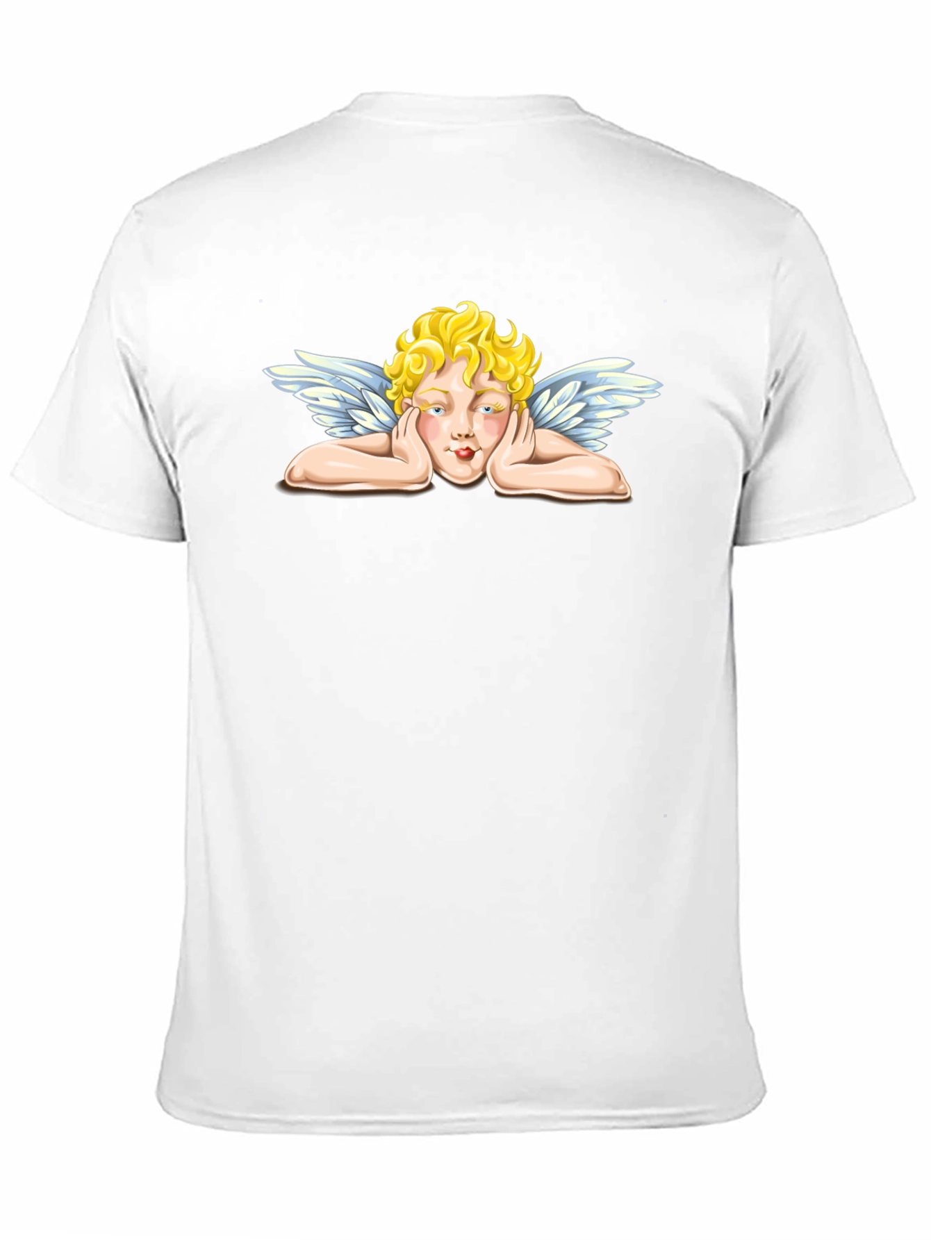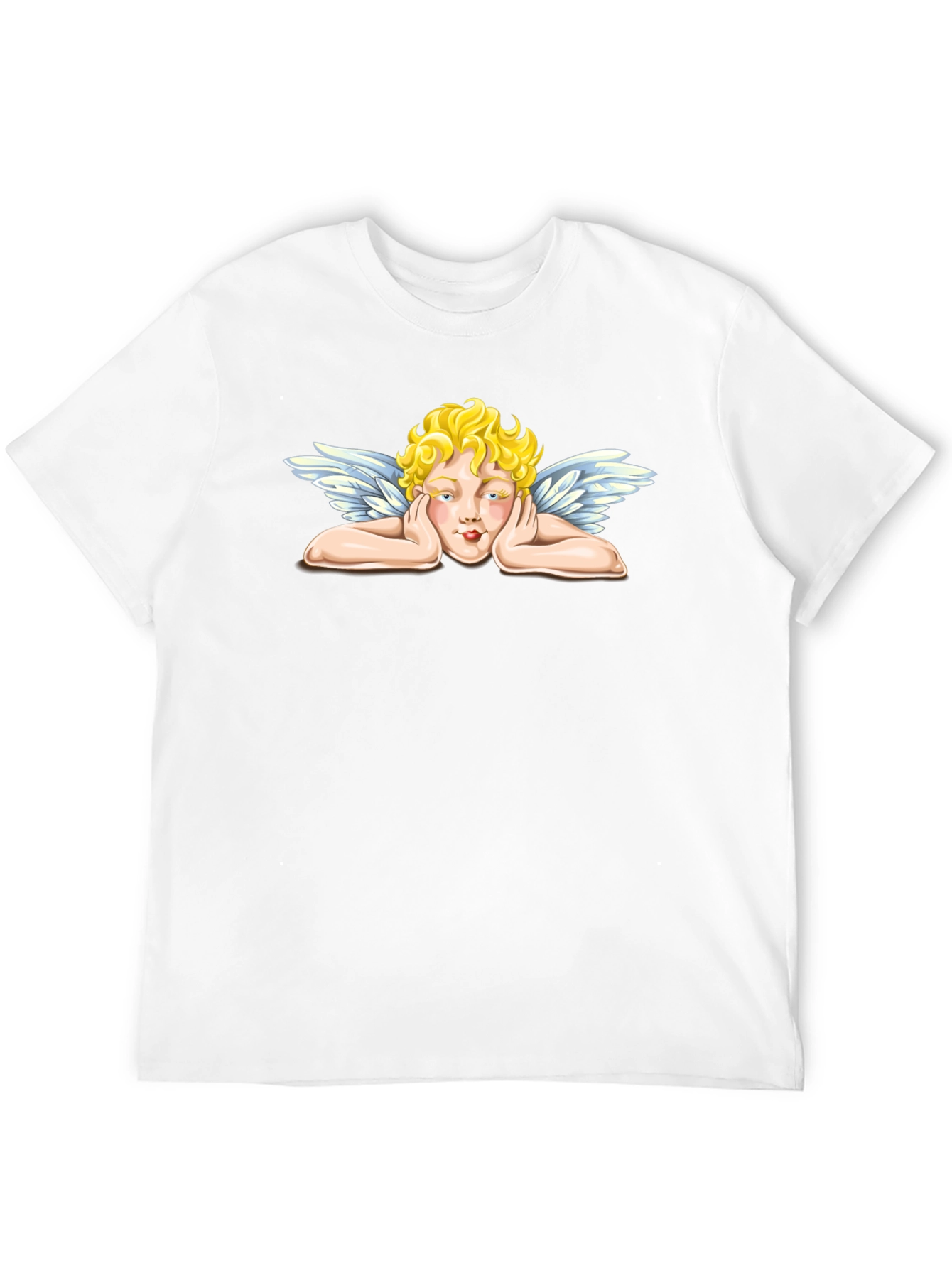 Show off your unique style with this eye-catching black t-shirt featuring a captivating angel graphic. The design showcases a charming angel resting its face in its hands, complete with golden curly hair and delicate wings. This crew neck tee offers a comfortable and relaxed fit, perfect for everyday wear. Made from a soft, breathable fabric, this shirt is as comfortable as it is stylish. Pair it with jeans, shorts, or your favorite casual bottoms for a laid-back yet fashionable look. A must-have for those who appreciate artistic and expressive apparel.