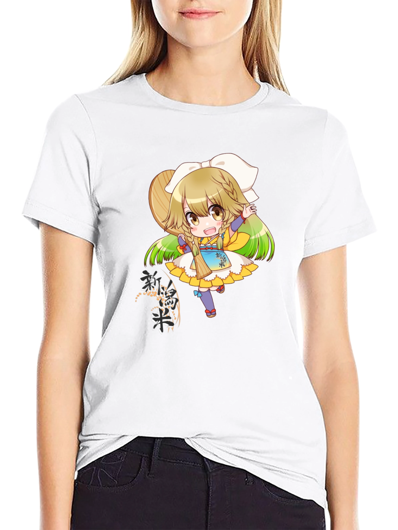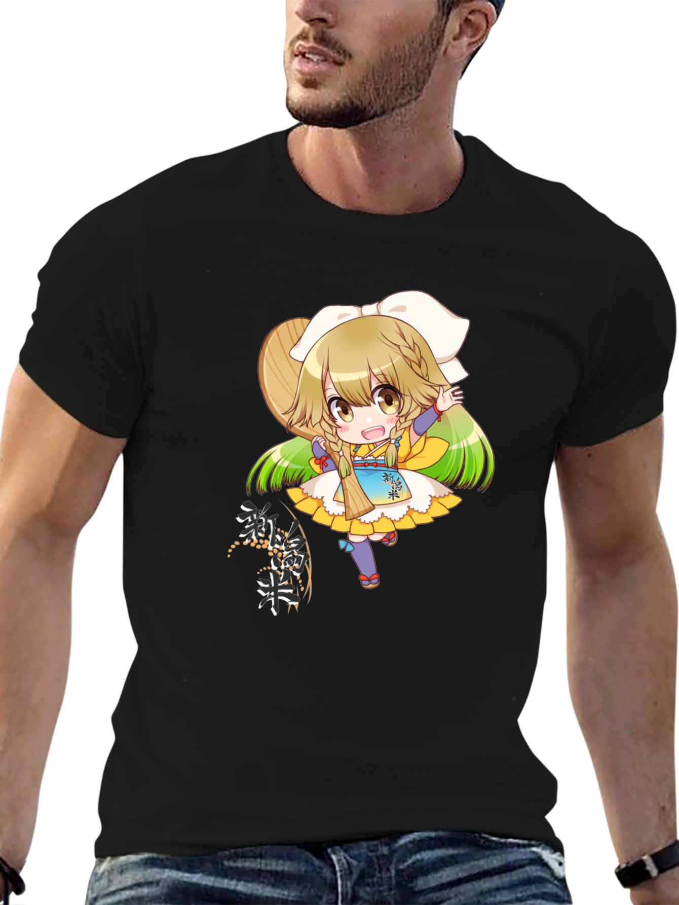 Add some fun to your wardrobe with this eye-catching black t-shirt! Featuring a vibrant anime girl graphic with intricate details and Japanese-inspired elements, this tee is sure to turn heads. The design showcases a cute, stylized character with bright colors and playful imagery. The garment is made from what appears to be a soft, comfortable fabric, perfect for everyday wear. Whether you're a fan of anime or simply love unique graphic tees, this piece offers a blend of style and personality. Pair it with jeans or shorts for a casual, cool look that expresses your individual flair.