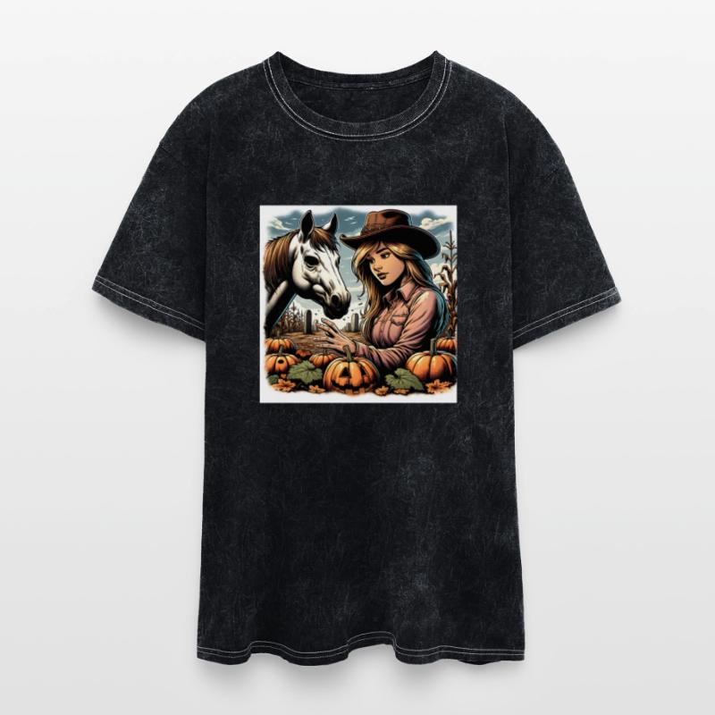 Cowgirl and Horse in Autumn Pumpkin Patch