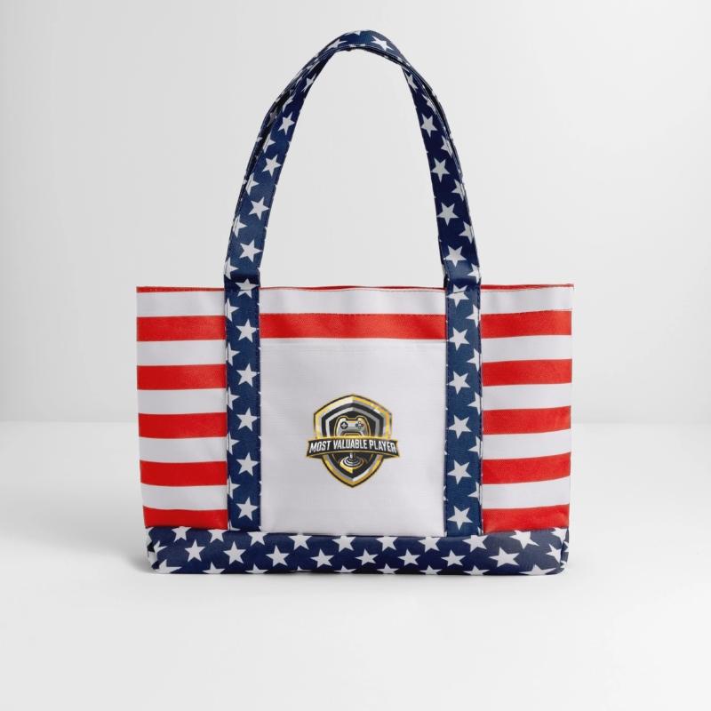 Show off your patriotic flair with the Americana Tote Bag, a perfect accessory for both everyday use and leisure outings. This tote features a vibrant stars and stripes pattern that captures the spirit of Americana with a classic and eye-catching design. It's not just about looks—this bag is as functional as it is fashionable. The front features a spacious white print area on an open pocket, ideal for easy access to essentials like your phone or keys. Whether you're heading to a barbecue or running to the grocery store, this tote bag combines national pride with practicality, ensuring you carry your necessities in style.